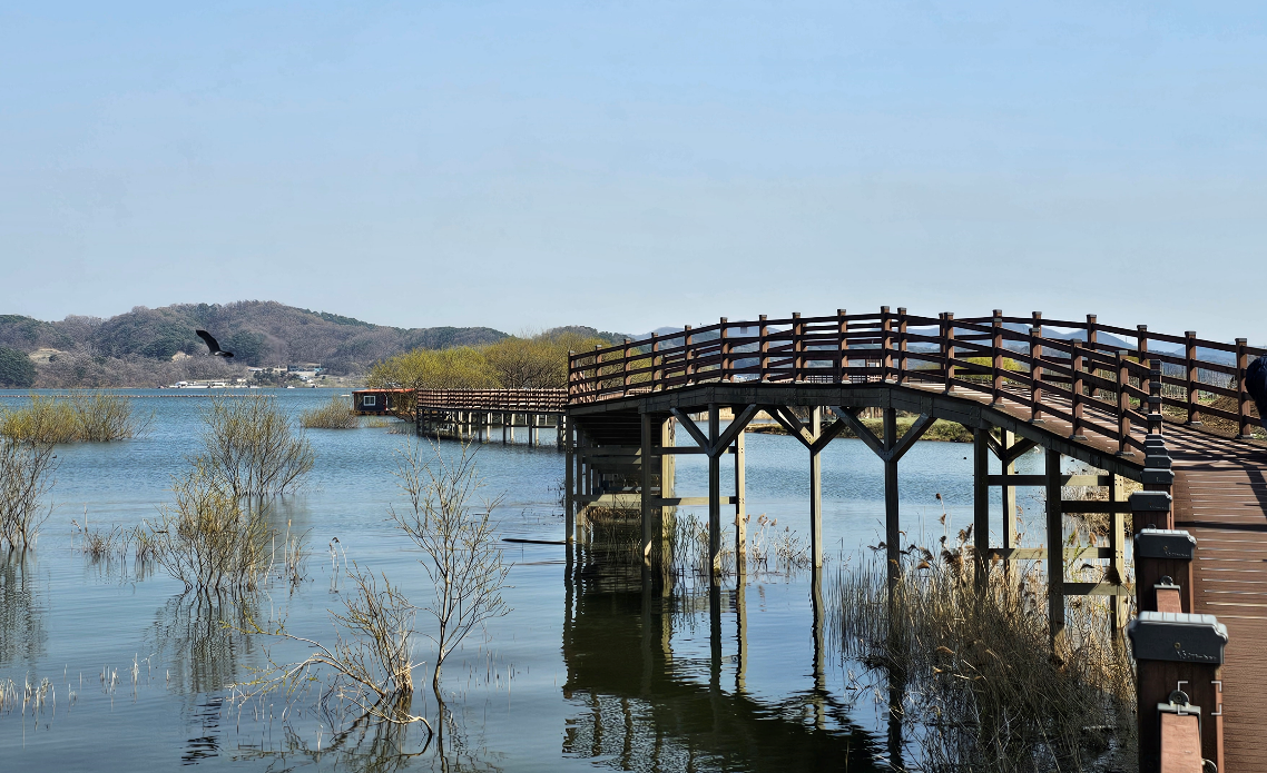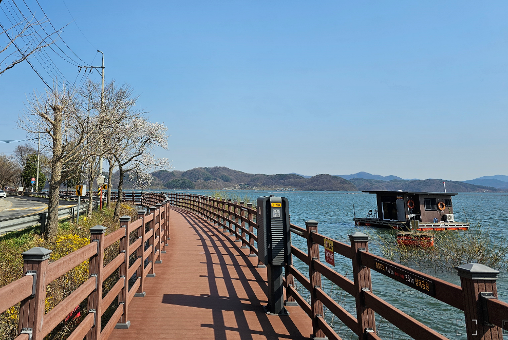 예당호 출렁다리를 경험하고 나오시면 출렁다리 오른쪽편으로 호반을 따라 걸을 수 있는 데크길이 있습니다. 이 길을 따라 걸으면 호수가를 약 5km 정도 산책할 수 있습니다. 가까운 부분까지는 사람들이 좀 많지만, 조금만 더 가시면 아주 쾌적하게 호숫가를 강아지와 산책할 수 있답니다. 저희는 데크가 놓여있는 끝까지 산책을 하고 왔습니다.